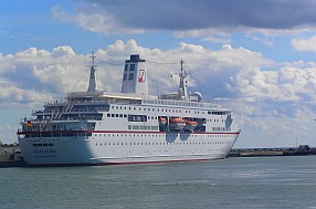 Na zdjęciu: niemiecki wycieczkowiec "Deutschland" w porcie w R?nne (fot. Jakub Bogucki)